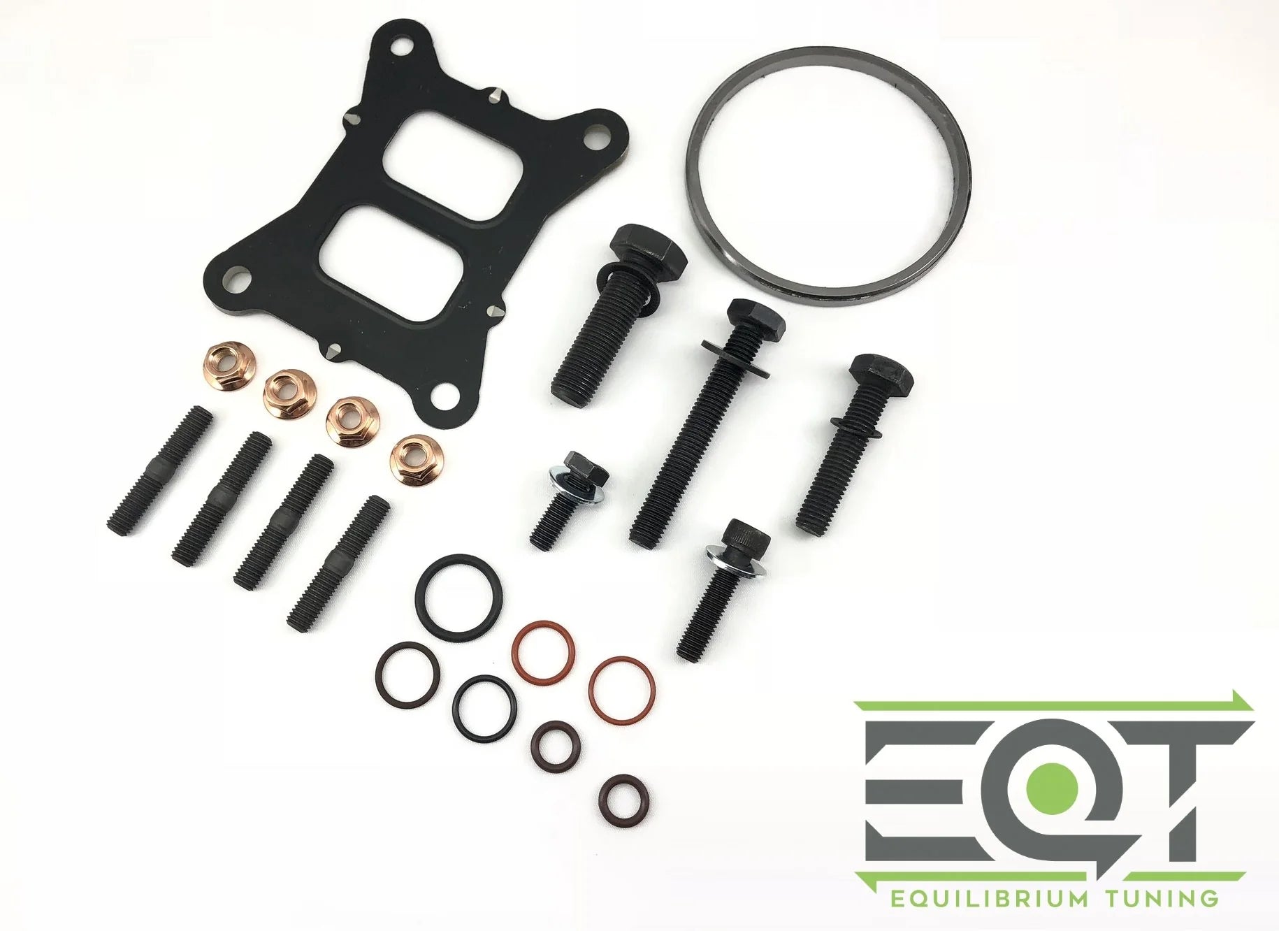Our EQT Vortex is a complete bolt-on turbo that is manufactured with all brand new components and includes new installation hardware (pictured). The housings are modeled after the OEM IS20/IS38 turbochargers for proper fitment, but they are all brand new and original castings made and machined for the specific wheels we use. The turbine is a TD06SL2 wheel measuring at 61mm/54mm and the compressor is a custom billet wheel measuring at 53mm/71mm base with a 76mm extended tip design. The entire turbo is manufactured, assembled, and VSR balanced in a state of the art facility.